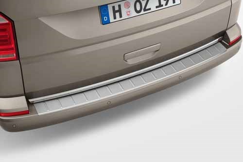 Protector de plástico para el canto de carga, hecho a medida y en óptica de acero inoxidable de gran calidad. Preserva el parachoques de los arañazos al cargar y descargar el maletero. Se pega fácilmente. Para VW Multivan, Caravelle y California.