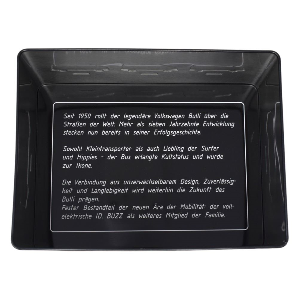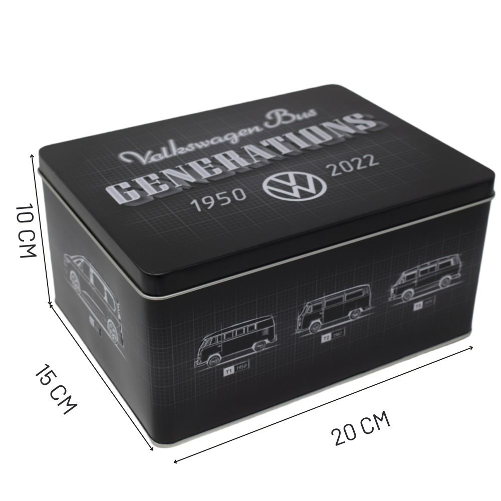 La lata para galletas Volkswagen está hecha con materiales de primera calidad. Tiene un recubrimiento de barniz. La superficie es brillante y con relieve. Incluye en relieve varios modelos del volkswagen ID bus desde 1950 a 2022 . Por eso, la lata para galletas tiene un aspecto elegante aportando un toque especial en el hogar.