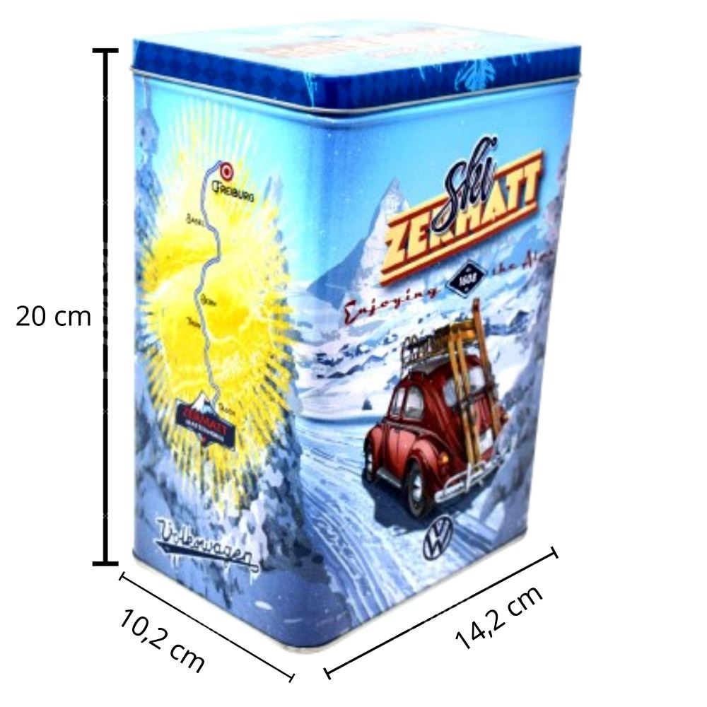 La lata para galletas Volkswagen está hecha con materiales de primera calidad. Tiene un recubrimiento de barniz. La superficie es brillante y con relieve. Incluye en relieve el elemento del coche escarabajo. Por eso, la lata para galletas tiene un aspecto elegante aportando un toque especial en el hogar.