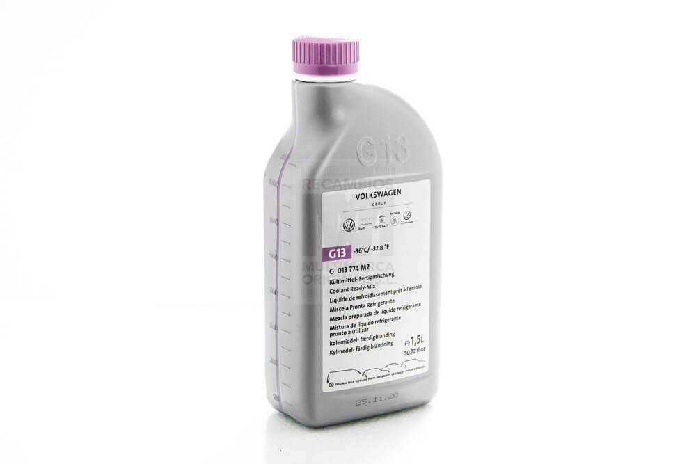 artículo original de VW y con un precio bastante ajustado si se compara con otros vendedores. este g13 de 1.5l por botella, ya viene listo y mezclado para usar directamente en el circuito de refrigeración del coche. si el circuito lo tienes limpio y bien, este líquido, te puede durar años y años hasta su siguiente cambio ... por no decir, que oficialmente VW, lo da casi de como de por vida del coche
