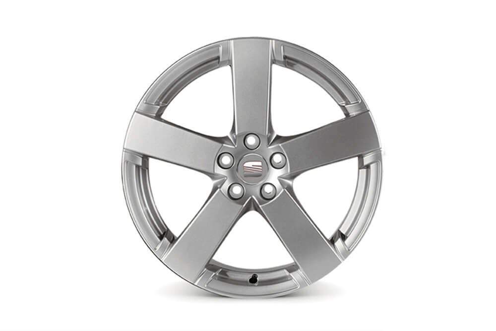 Llanta de aleación de aluminio, 7x17", ET43, anclaje 5/100, 5 radios, color plata, incluye tapabujes con logo SEAT. Tapabujes para reposición ref 6LL601171 UFT. Accesorio original SEAT. *Producto no homologado para versión Ecomotive.
