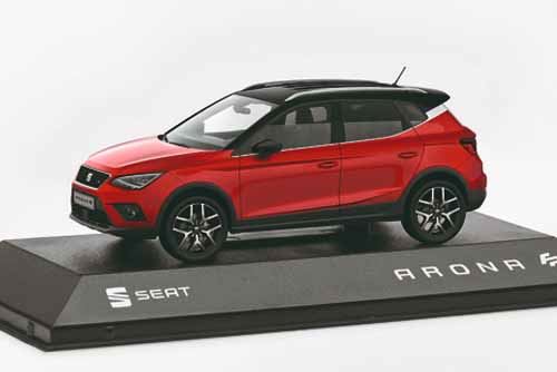 Modelo de coleccionista ARONA FR con gran nivel de detalle a escala 1:43. Material: metal. Dimensiones: 165 x 73 x 70 mm. Color: rojo Desire, interior: negro. Accesorio original SEAT.