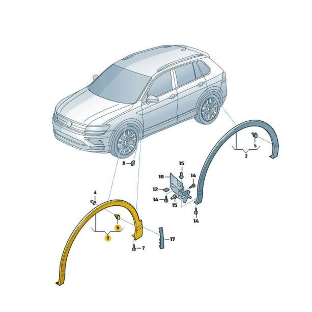 ¿Buscas la moldura de paso de rueda delantera izquierda para tu Volkswagen Tiguan? Esta pieza original es perfecta para reemplazar la moldura dañada o desgastada de tu SUV. Diseñada especialmente para el Tiguan, asegura un ajuste preciso y una calidad duradera. Además, su diseño elegante mantiene la apariencia original de su vehículo.