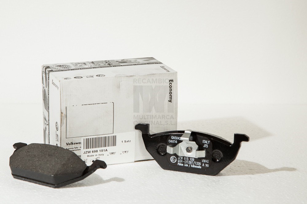 Las pastillas de freno transmiten el par de frenado al disco de freno y desde allí, a través de la llanta y los neumáticos, a la calzada. Recambio original Volkswagen, Audi, Seat y Skoda.