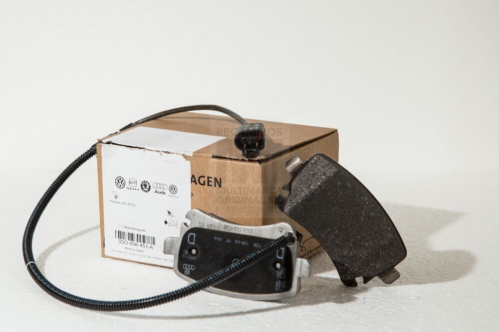 Juego de cuatro pastillas traseras. Las pastillas de freno transmiten el par de frenado al disco de freno y desde allí, a través de la llanta y los neumáticos, a la calzada. Recambio original Volkswagen, Audi, Seat y Skoda.