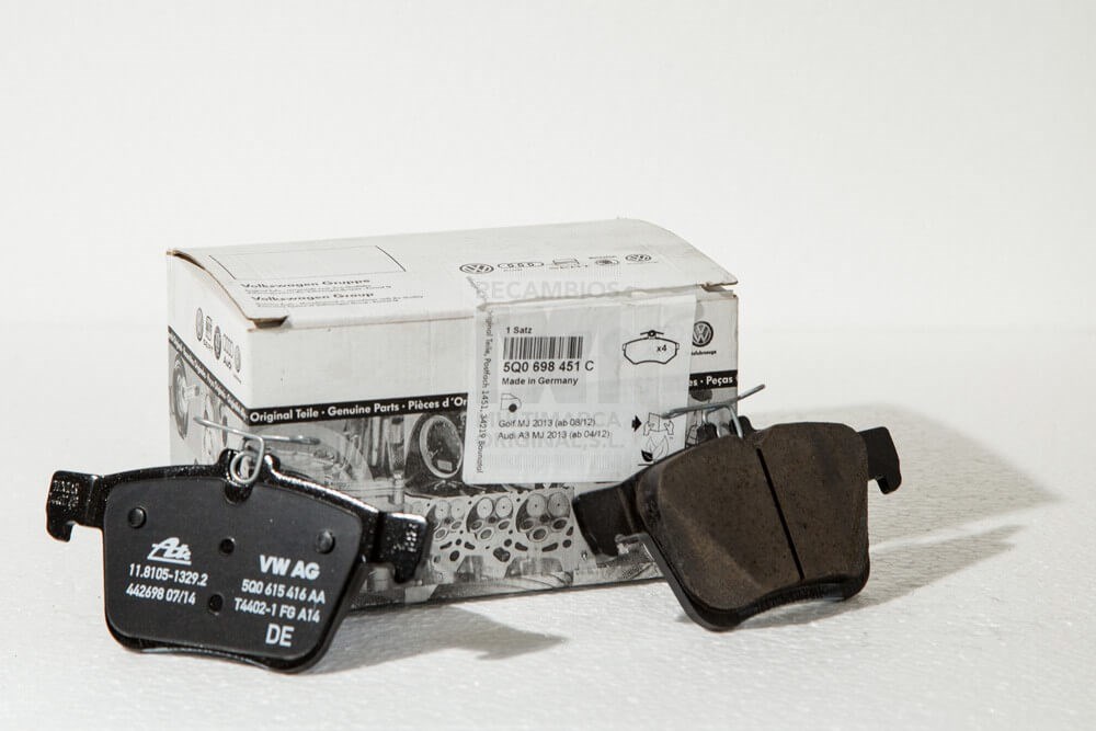 Juego de cuatro pastillas traseras. Las pastillas de freno transmiten el par de frenado al disco de freno y desde allí, a través de la llanta y los neumáticos, a la calzada. Recambio original Volkswagen, Audi, Seat y Skoda.