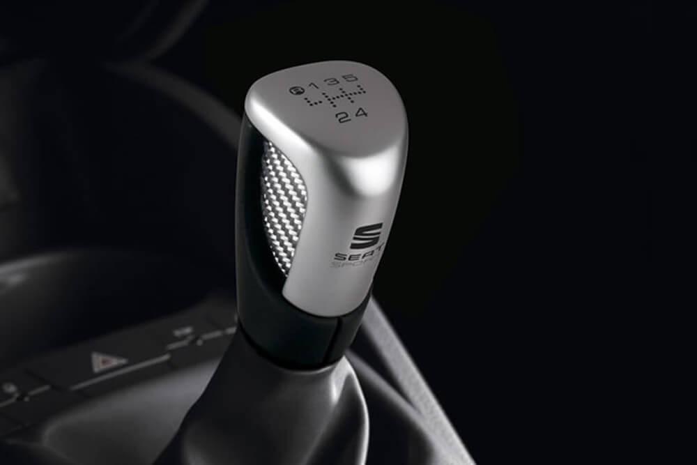 Pomo de cambio forrado de piel negra y carcasa superior pintada en color de aluminio. Accesorio original SEAT.