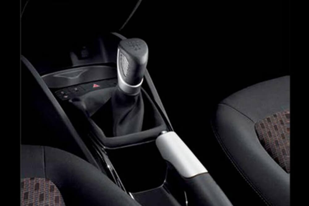 Pomo de cambio pintado en color aluminio y carcasa superior forrada de piel negra. Accesorio original SEAT.